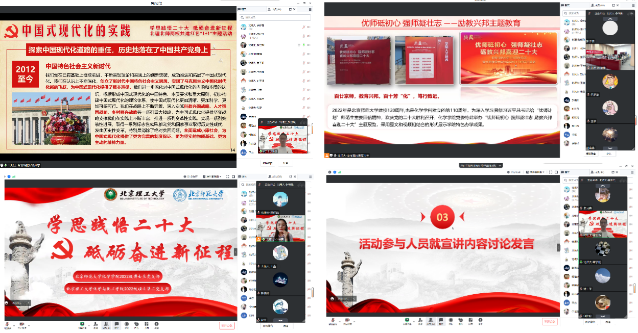 6月12日下午,两支部开展线上宣讲活动,北京理工大学化学与化工学院2022级硕三支部的支部书记张世琛介绍了北京理工大学化学与化工学院的党建工作基本情况并做《中国式现代化的理论精髓——深入学习党的二十大精神》主题党课宣讲;2022级博士生党支部书记李祥园介绍了本支部的党建工作基本情况并做《优师砥初心 强师凝壮志——励教兴邦主题教育》主题党课宣讲。听完两位支部书记的精彩党课内容后,两支部成员对所学所感进行了深入的发言和讨论,纷纷表示以实际行动践行党的二十大精神,努力做到以学铸魂、以学增智、以学正风、以学促干,展现当代青年学生党员的责任与担当。